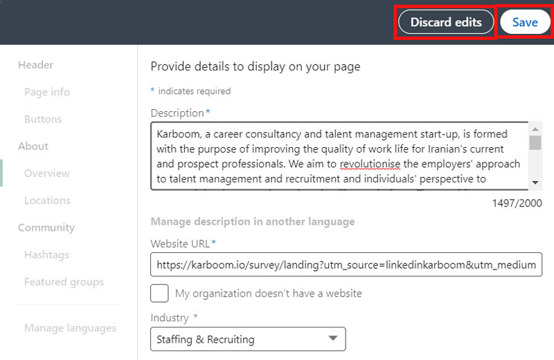 کارهای متنوعی وجود دارند که میتوانید برای اعمال تغییرات در Company Page انجام دهید. هرچه تلاش بیشتری در این زمینه کنید و وقت بیشتری اختصاص دهید، احتمال ایجاد تعامل با کاربران لینکدین بیشتر میشود. مطمئن شوید که یک لوگو و یک عکس پسزمینه، یک توضیح کوتاه در مورد شرکت، تخصصهای شرکت شما، محل و وبسایت شرکت را حتما در صفحه قرار داده باشید.